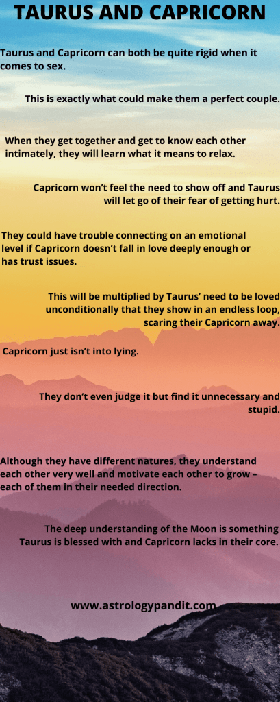 When it comes to a taurus man and capricorn woman dating (or vice versa), there is no guarantee that the chemistry will be there because there is much. Taurus and capricorn can both be quite rigid when it comes to sex. Are they compatible in love and sex? With each finding someone who can match their stamina, passions can explode and neither can resist returning to the other time and time again. In addition to this, you are always ready to learn new styles when you come together to have sex.